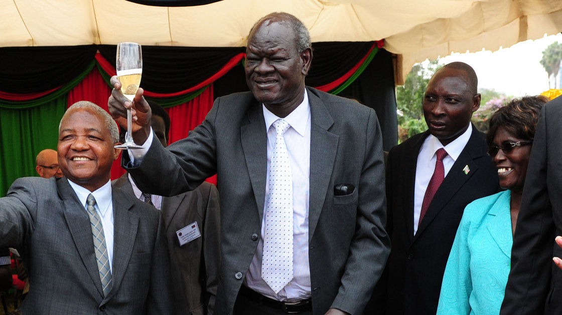 January 6, 2014[NPR News] — South Sudan’s then-Minister of Higher Education, Science and Technology Peter Adwok Nyaba (center) celebrates the first anniversary of the country’s independence in Nairobi, capital of Kenya, on July 9, 2012. Since then, all of South Sudan’s Cabinet ministers have been sacked — including Adwok — for allegedly conspiring to overthrow President Salva Kiir.