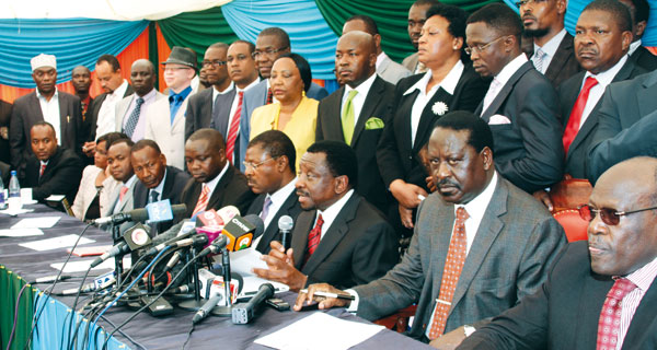ODM leader Raila Odinga (second right) and other CORD leaders during a press briefing on the outcome of their meeting in Nairobi, Tuesday. [Photo: Mbugua Kibera/Standard]