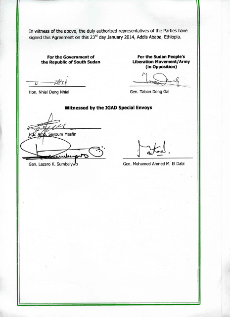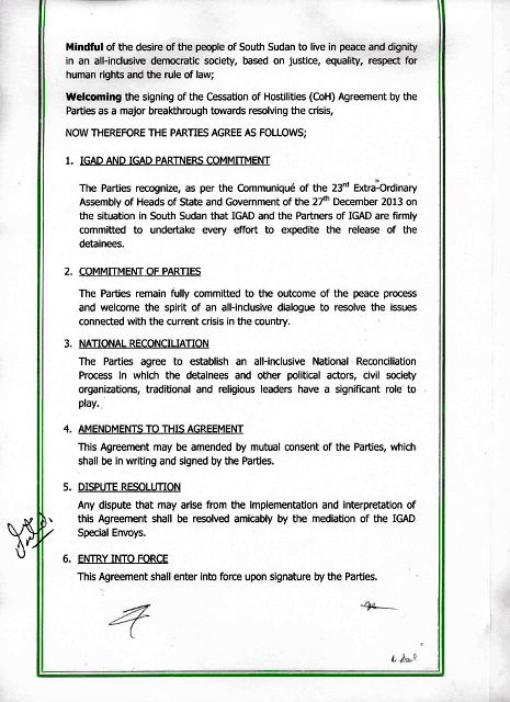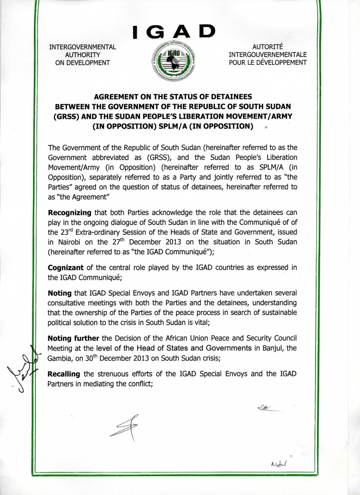 Within the ceasefire agreement the status of South Sudan political detainees was yesterday signed by rebels and government representatives as witnessed by IGAD mediators in the Ethiopian capital Addis Ababa.